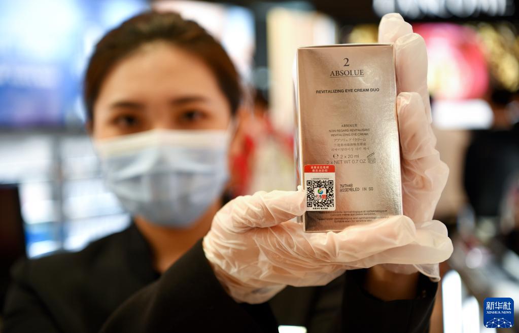 7月31日,海口日月广场免税店工作人员展示加贴溯源码的商品。新华社记者 郭程 摄