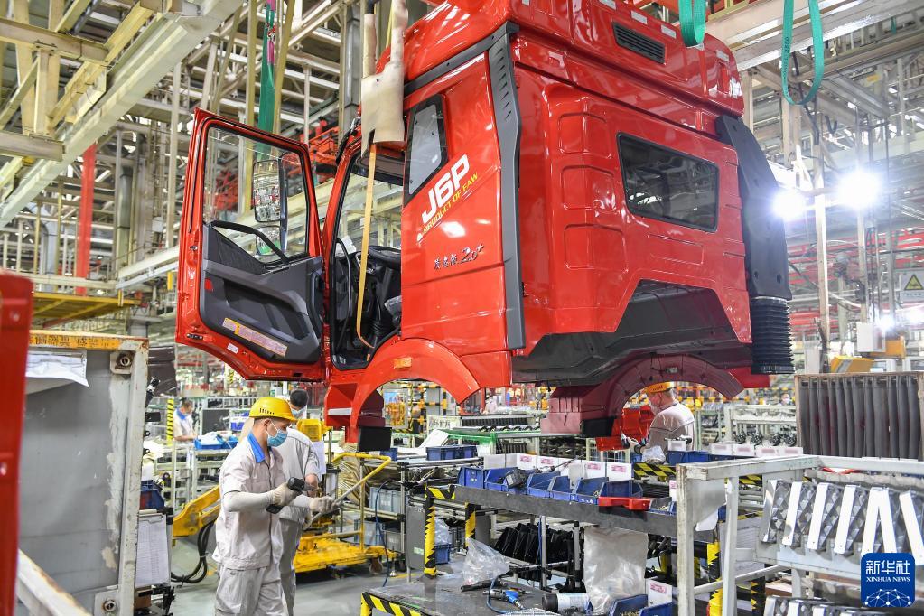 工人在位于长春的一汽解放总装车间装配车辆(7月7日摄)。新华社记者 张楠 摄