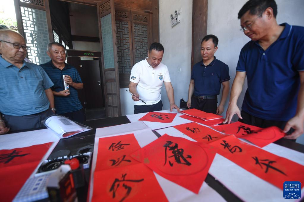 9月1日,杭州市临安区高虹镇廉政文艺宣传队队员在写廉政文化对联。