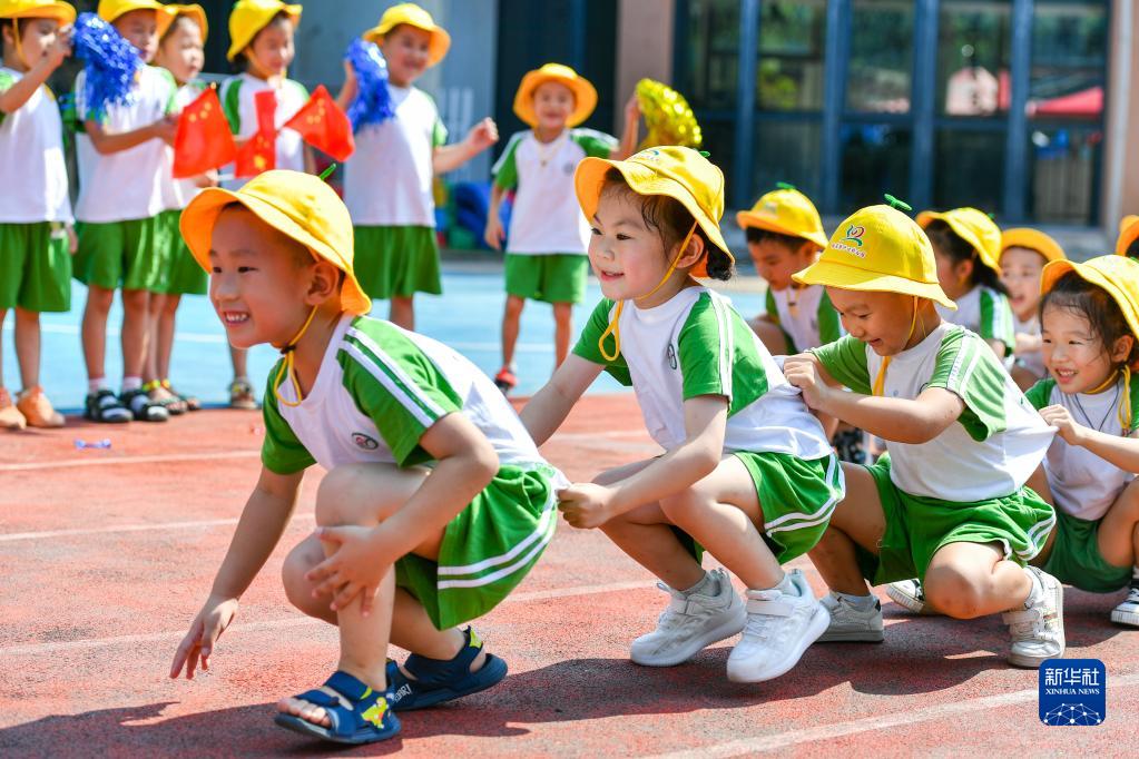 9月1日,在浙江省湖州市长兴县泗安镇中心幼儿园,孩子们参与趣味运动。