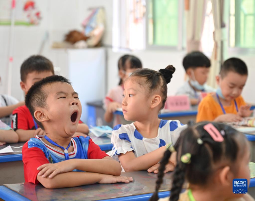 9月1日,在福建省石狮市鹏山师范附属小学,聪聪在发书前打哈欠。想到即将上小学,聪聪昨晚激动得很迟才入睡。