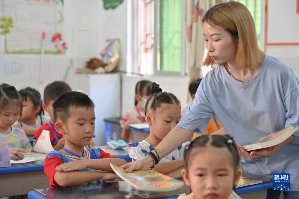 9月1日,在福建省石狮市鹏山师范附属小学,老师给聪聪发书。