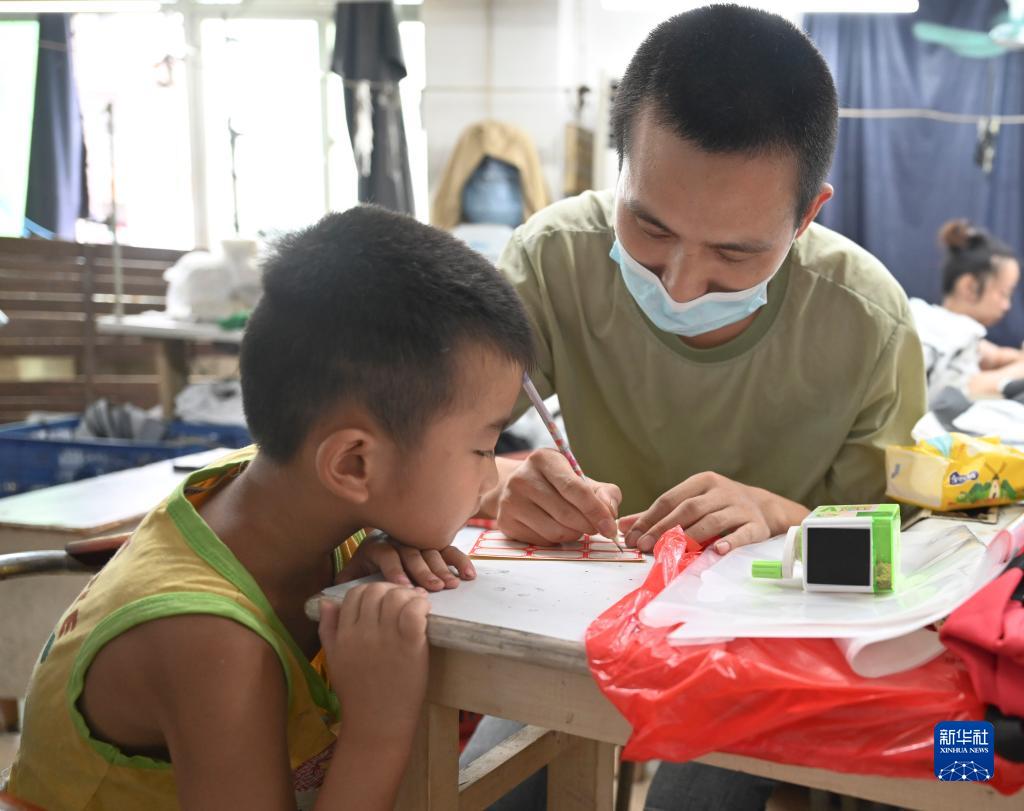 8月31日,在福建省石狮市金利莱斯服装厂,聪聪的父亲黄海龙在帮聪聪写姓名贴。