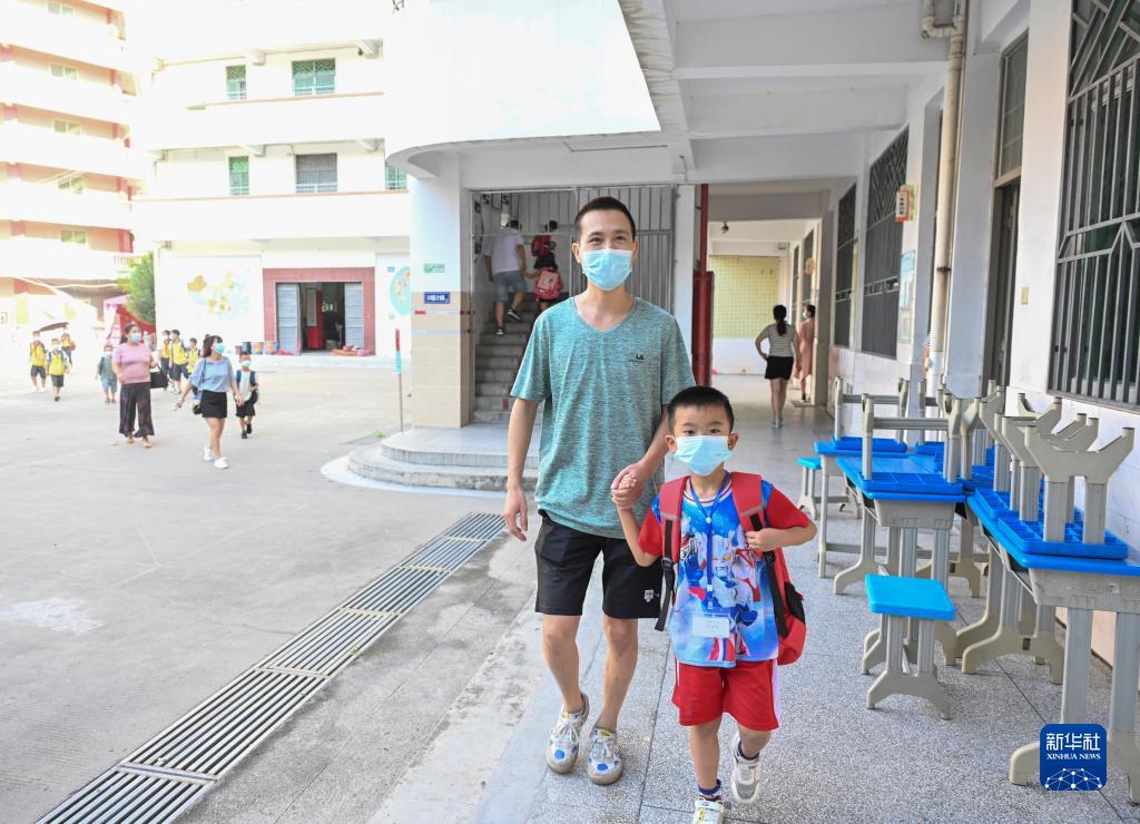 9月1日,在福建省石狮市鹏山师范附属小学,黄海龙送聪聪到班级。