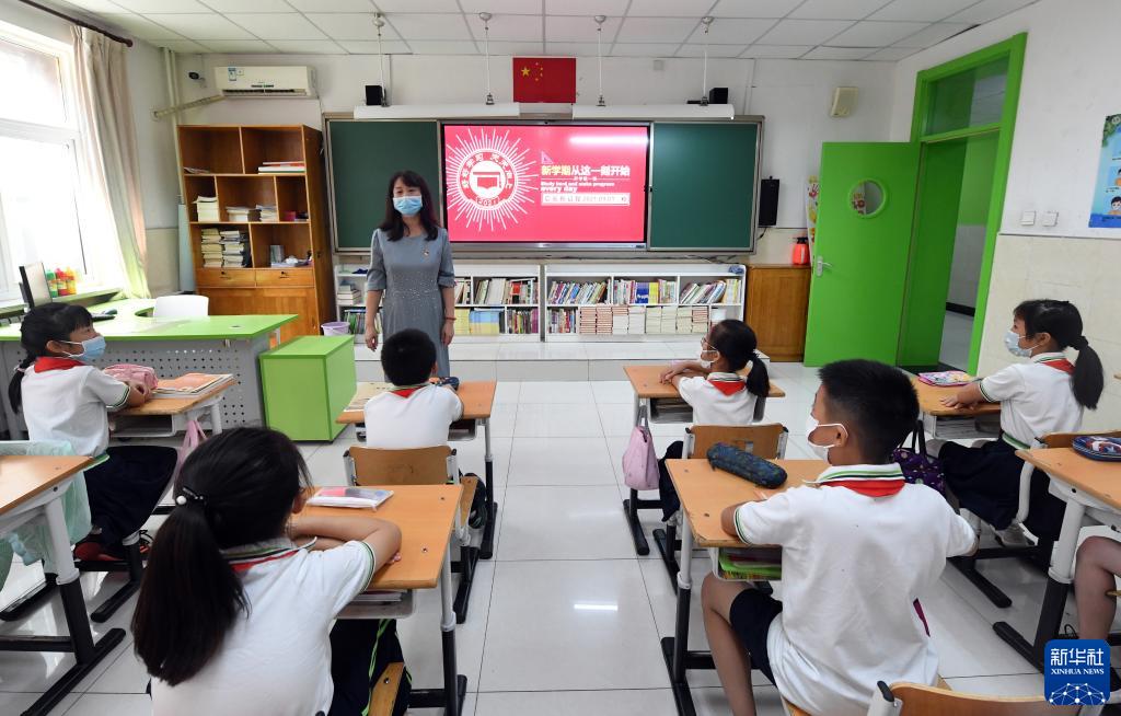 9月1日,在北京市海淀区太平路小学,五年级学生在上开学第一课。