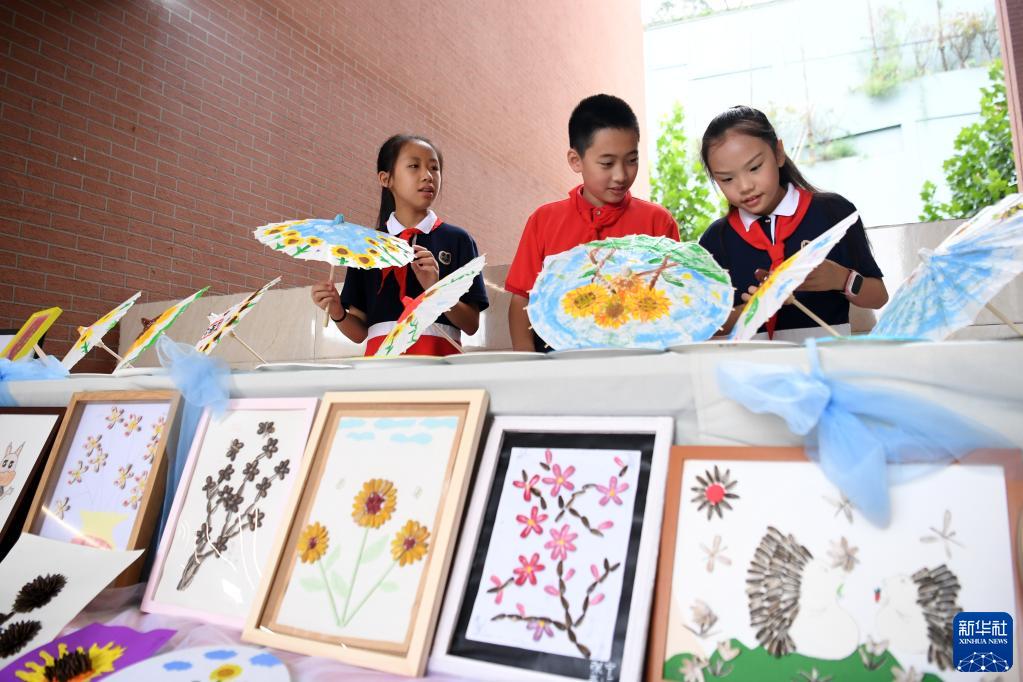 9月1日,重庆两江新区星湖学校举办以“七星少年,向阳而生”为主题的开学典礼,活动通过向日葵主题劳动成果分享,让孩子们感受劳动的快乐。这是学生们在活动上参观“瓜子拼图大赛”作品。