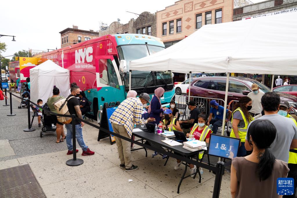 8月31日,人们在美国纽约街头的流动疫苗接种车外排队等候接种新冠疫苗。