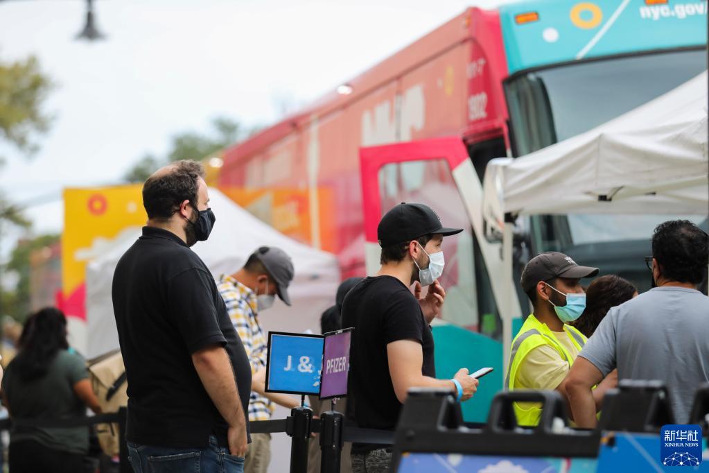 8月31日,人们在美国纽约街头的流动疫苗接种车外排队等候接种新冠疫苗。