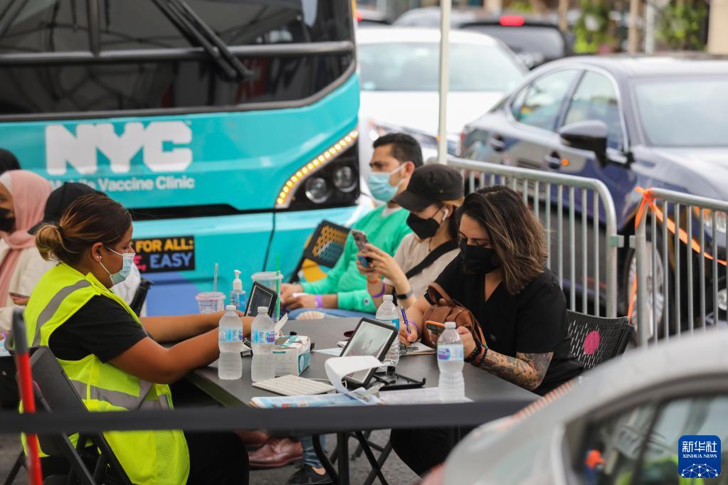 8月31日,人们在美国纽约街头的流动疫苗接种车外登记接种新冠疫苗。