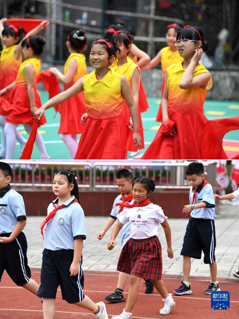 这是一张拼版照片,上图:5月28日,张清语(前排左一)和同学们在璜尖中心小学排练儿童节的节目;下图:9月1日,张清语在合肥市芙蓉小学准备参加开学典礼。新华社记者 刘军喜 摄