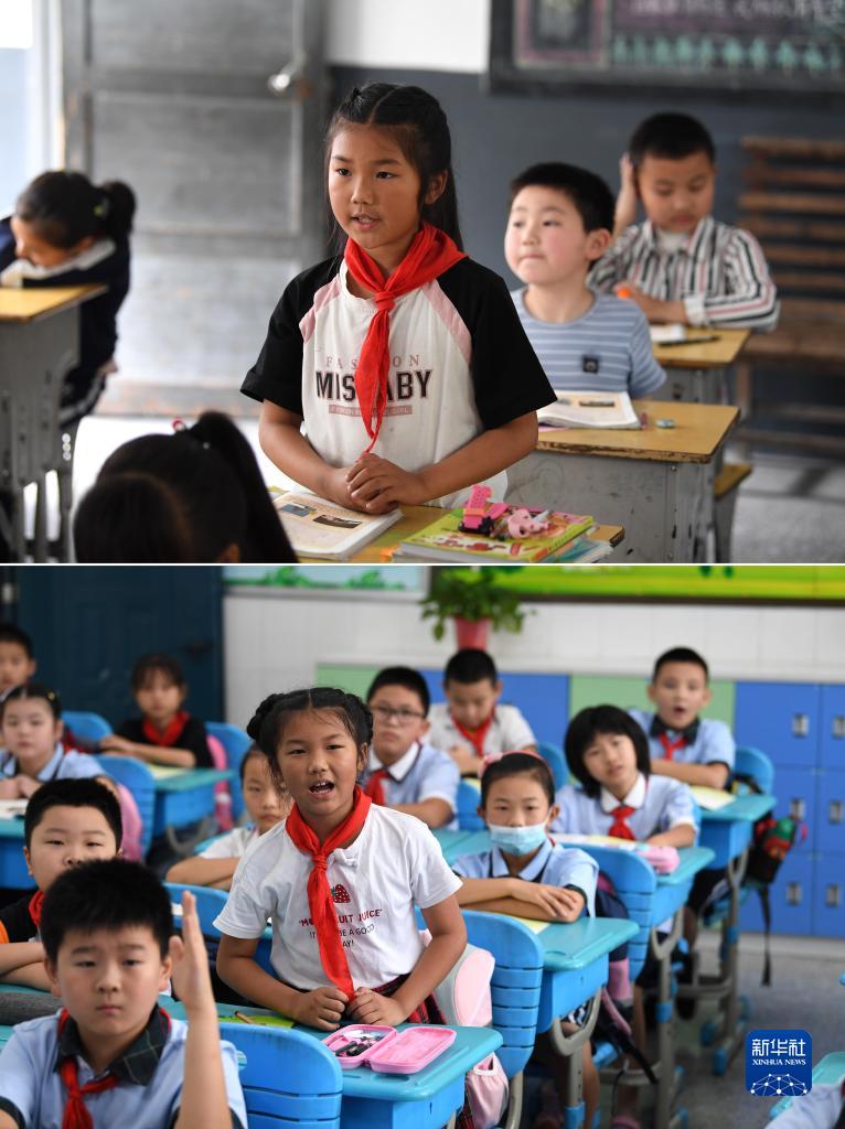 这是一张拼版照片,上图:5月27日,张清语在黄山市休宁县璜尖中心小学上课;下图:9月1日,张清语在合肥市芙蓉小学上课。新华社记者 刘军喜 摄