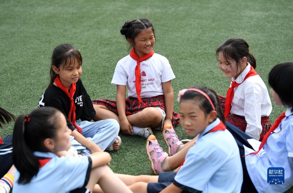 9月1日,张清语(中)和同学在校园里交流。新华社记者 刘军喜 摄
