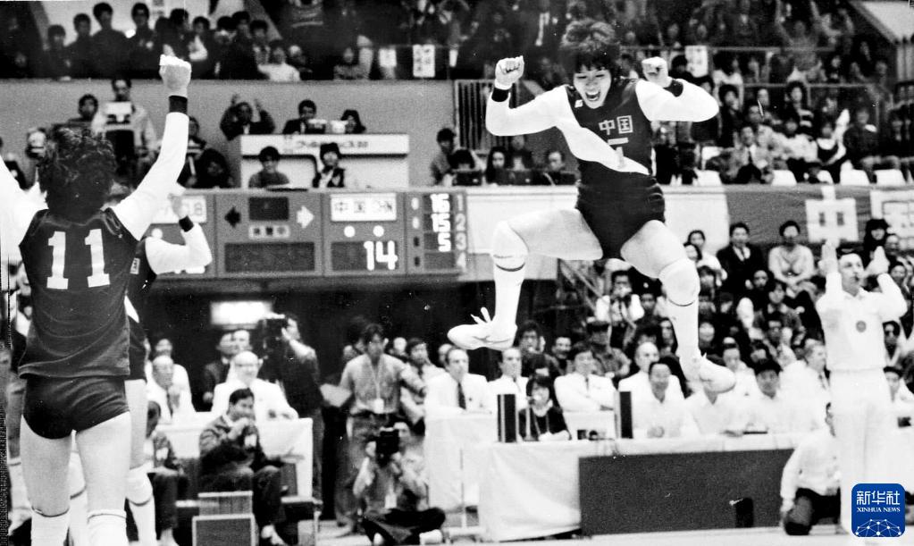 1985年11月17日,中国队以3比1战胜古巴队后,郎平高高跳起庆祝。新华社记者官天一摄
