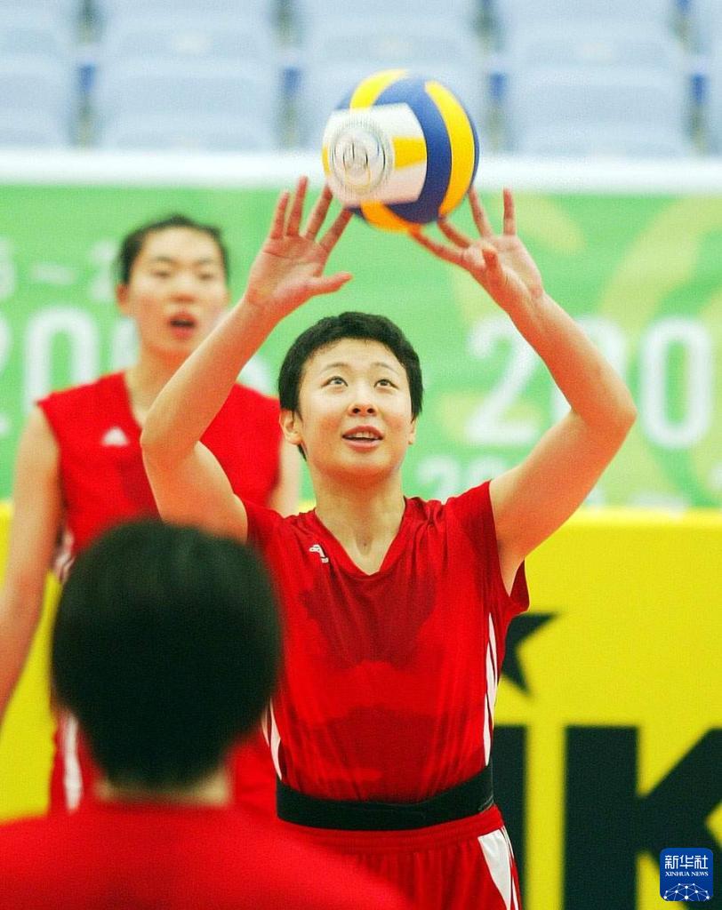2005年6月23日,中国女排队员冯坤(右)、张萍(后)在进行战术训练。新华社记者毕明明摄