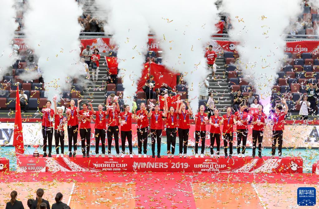 2019年9月29日,第十三届女排世界杯颁奖仪式在日本大阪举行,中国队在本届比赛中以十一连胜的战绩夺得了冠军。新华社记者杜潇逸摄