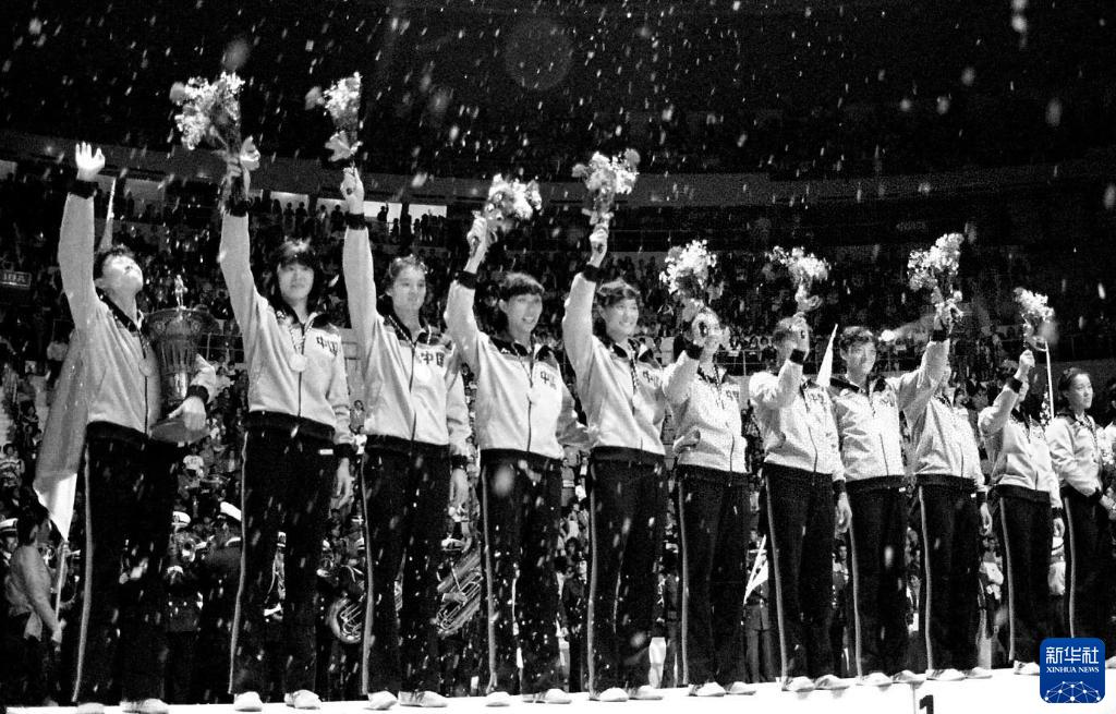 1982年9月25日,中国女排队员在第九届女排世锦赛颁奖仪式上向观众致意。新华社发