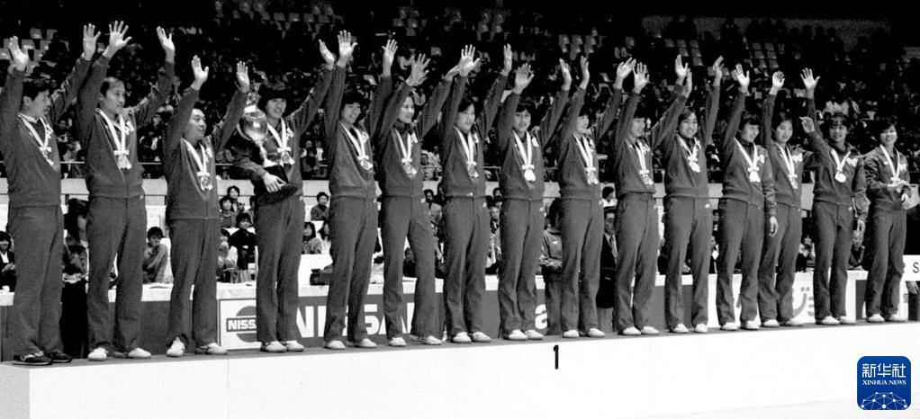 1985年11月20日,中国女排队员在第四届女排世界杯冠军颁奖仪式上向观众挥手致意。新华社记者官天一摄