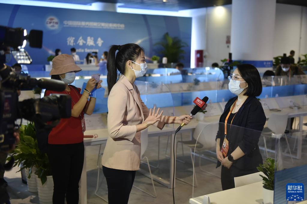 9月1日,媒体记者在2021年服贸会新闻中心内采访。