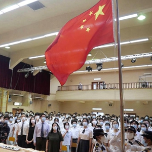 9月1日,在香港教育工作者联会黄楚标中学,白衣蓝帽护旗升旗小队正步走向旗杆。