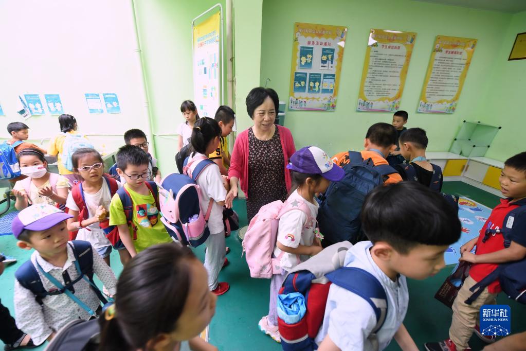 福建省福州市鼓楼区东街街道军门社区党委书记林丹来到军门社区“阳光朵朵”少儿托管中心看望放学后在这里托管的小朋友(6月23日摄)。新华社记者 林善传 摄