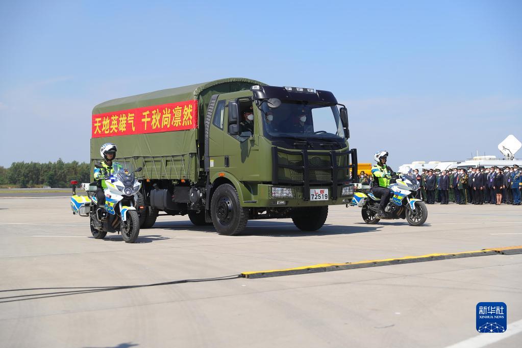 9月2日,载有志愿军烈士遗骸的军用车辆离开沈阳桃仙国际机场。