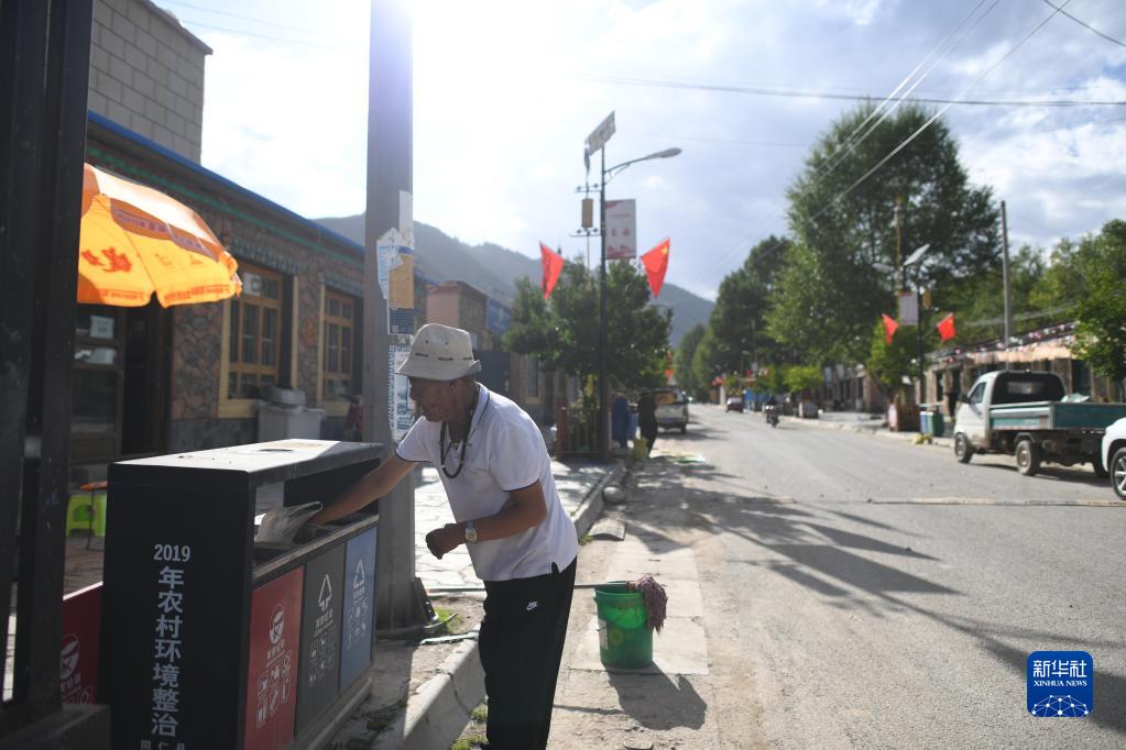9月1日,扎毛村村民完德卡将垃圾投放至垃圾桶。
