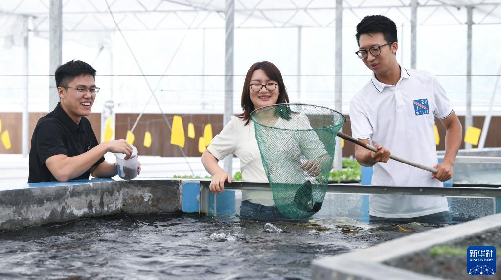 在广东江门开平市国家现代农业示范区内,罗伟特、谭慧敏、梁立锋(从左至右)在鱼菜共生生产基地查看养殖鱼类生长情况(9月2日摄)。