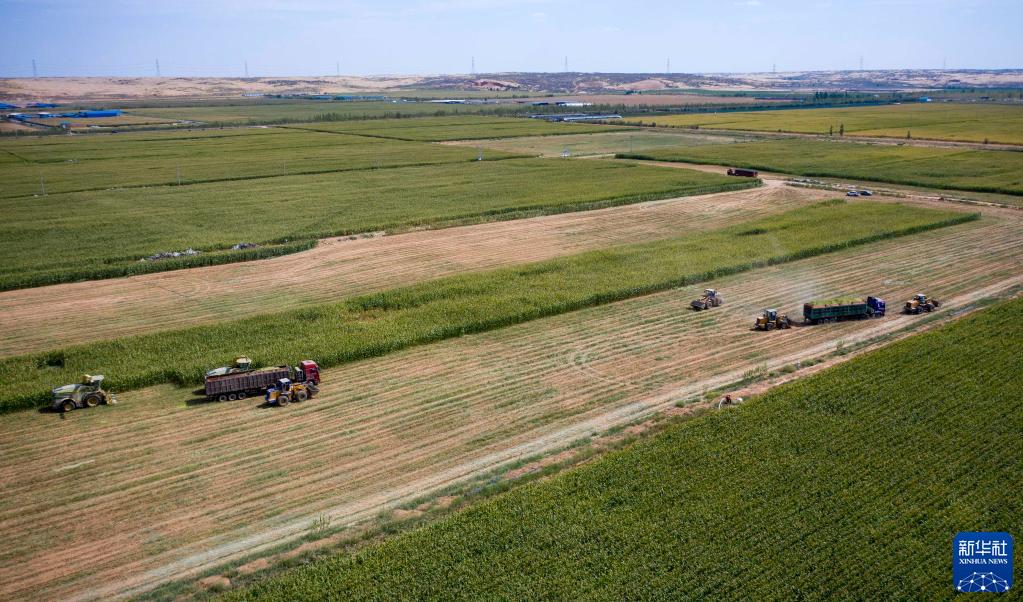 宁夏石嘴山市平罗县红崖子乡红瑞村的农民使用大型机械收获青贮玉米(9月2日摄,无人机照片)。新华社记者 杨植森 摄