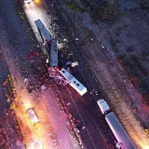 这张当地媒体提供的照片显示的是9月2日墨西哥西北部索诺拉州一辆巴士与货车相撞的事故现场。