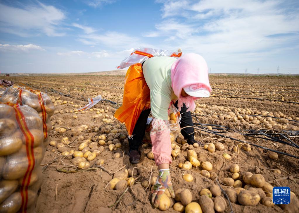 宁夏石嘴山市平罗县红崖子乡红瑞村的农民在收获马铃薯(9月2日摄)。
