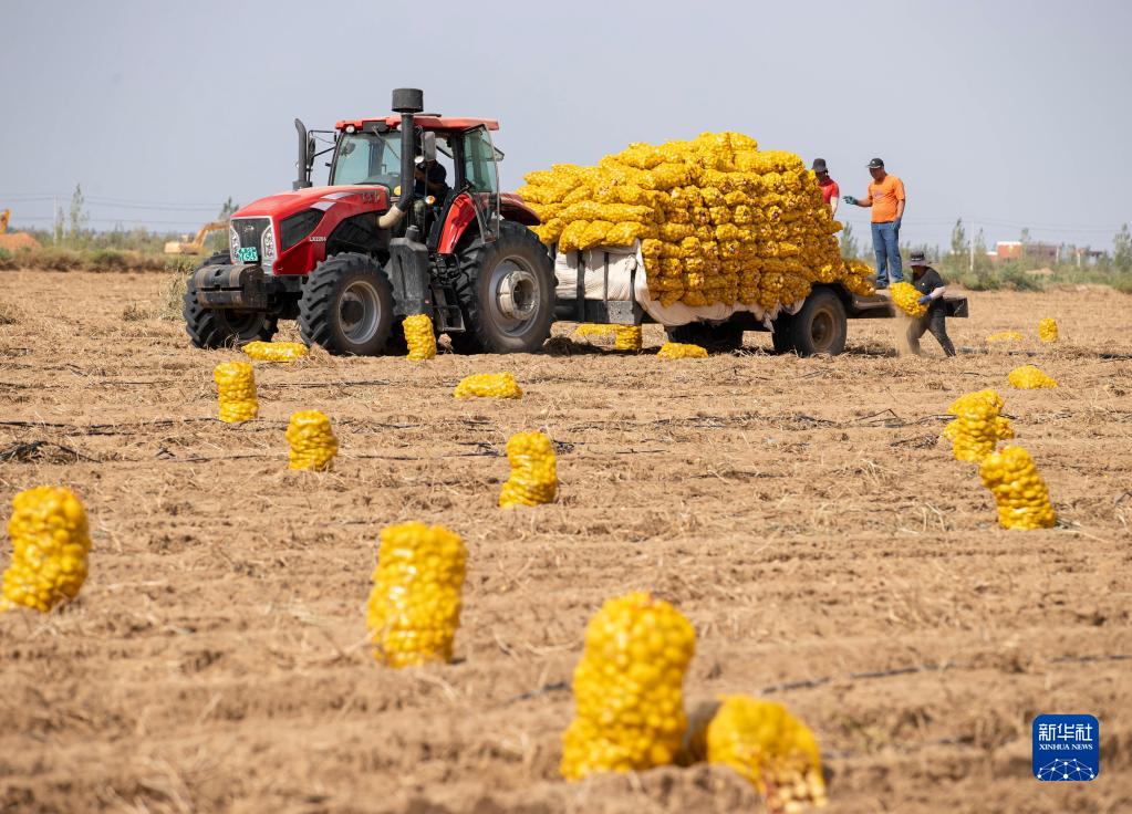 宁夏石嘴山市平罗县红崖子乡红瑞村的农民在搬运马铃薯(9月2日摄)。