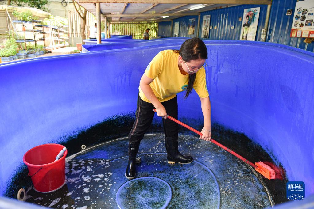 8月27日,志愿者兰甜在海龟救助站洗刷龟池。对女生来说,翻入龟池中刷洗并更换海水是件费力的事,每清洁一个龟池并护理一只海龟,至少需要半个小时。新华社记者 蒲晓旭 摄