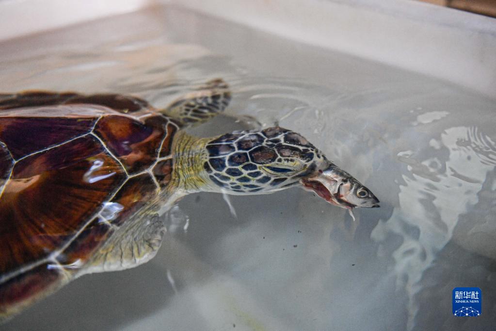 8月27日,救助站的海龟在吃志愿者投喂的食物。新华社记者 蒲晓旭 摄