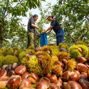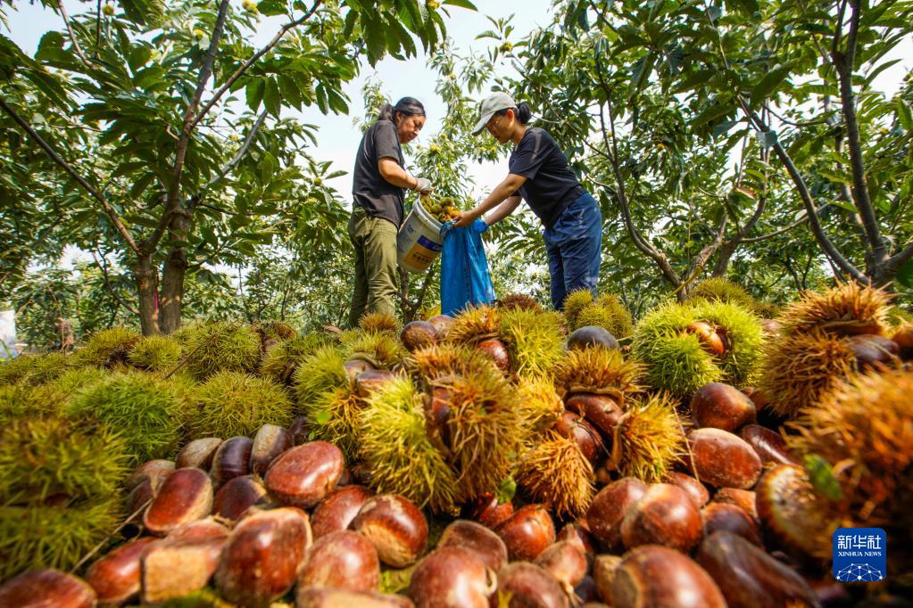 进入九月,河北省遵化市的板栗进入成熟、收获的季节,当地农民抓紧进行收获、剥栗蓬、直播销售和板栗加工等工作,山乡一片忙碌景象。