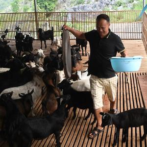 9月3日,在都安瑶族自治县大兴镇池花村一家种养专业合作社,一名村民在喂养山羊。
