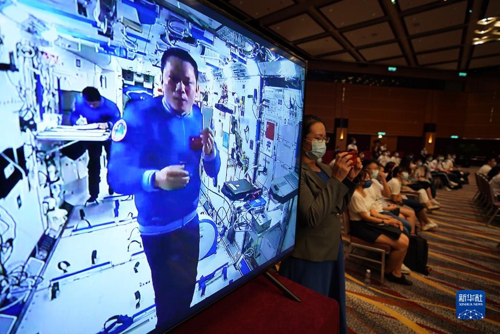 9月3日,正在天宫空间站执行任务的神舟十二号乘组与香港科技工作者、教师和大中学生进行天地连线互动。