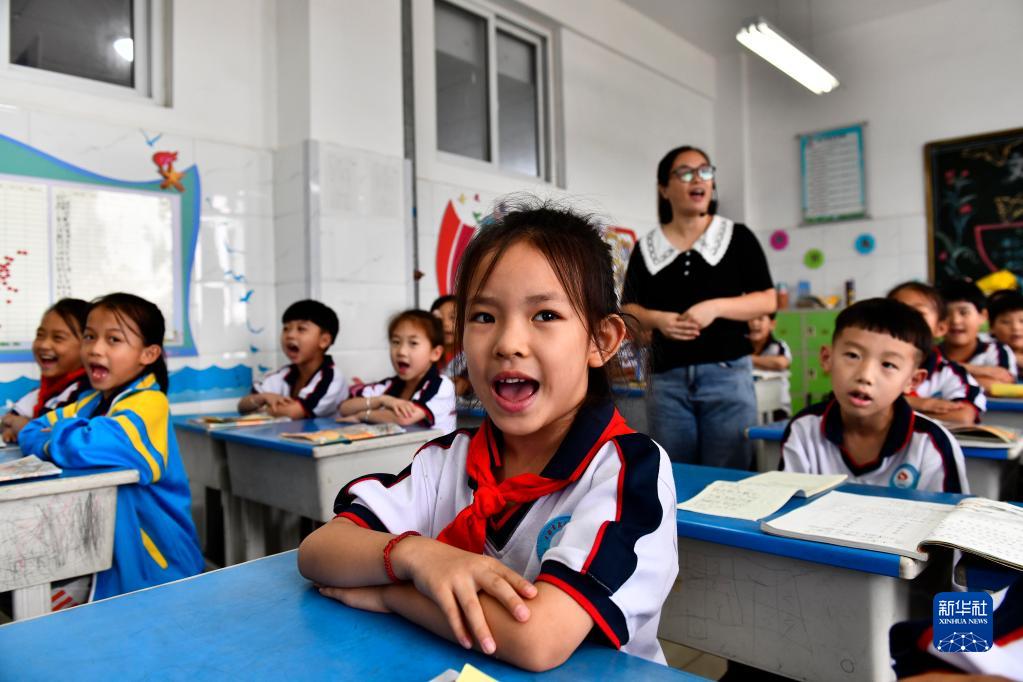 9月3日,在日照市岚山区岚山头小学,学生们在老师的陪伴下朗诵唐诗。