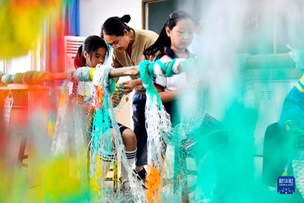 9月3日,在日照市岚山区岚山头小学,老师在指导学生学习织渔网。