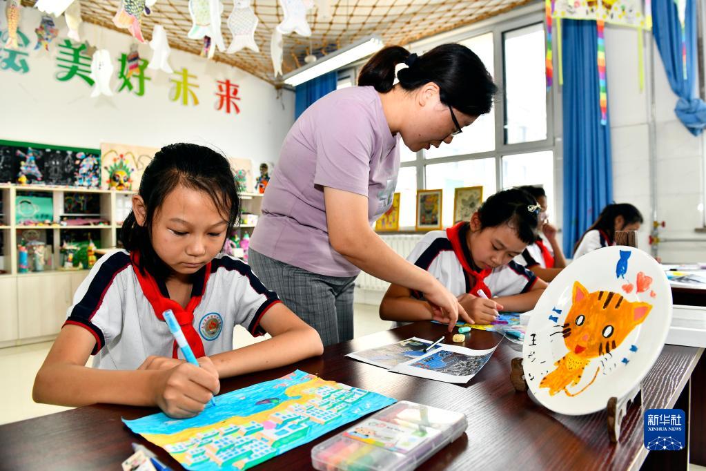 9月3日,在日照市岚山区岚山头小学,学生们在老师指导下学习画画。