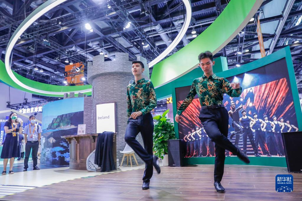 9月3日,演员在2021中国国际服务贸易交易会国别展区的爱尔兰展台表演富有爱尔兰特色的踢踏舞。