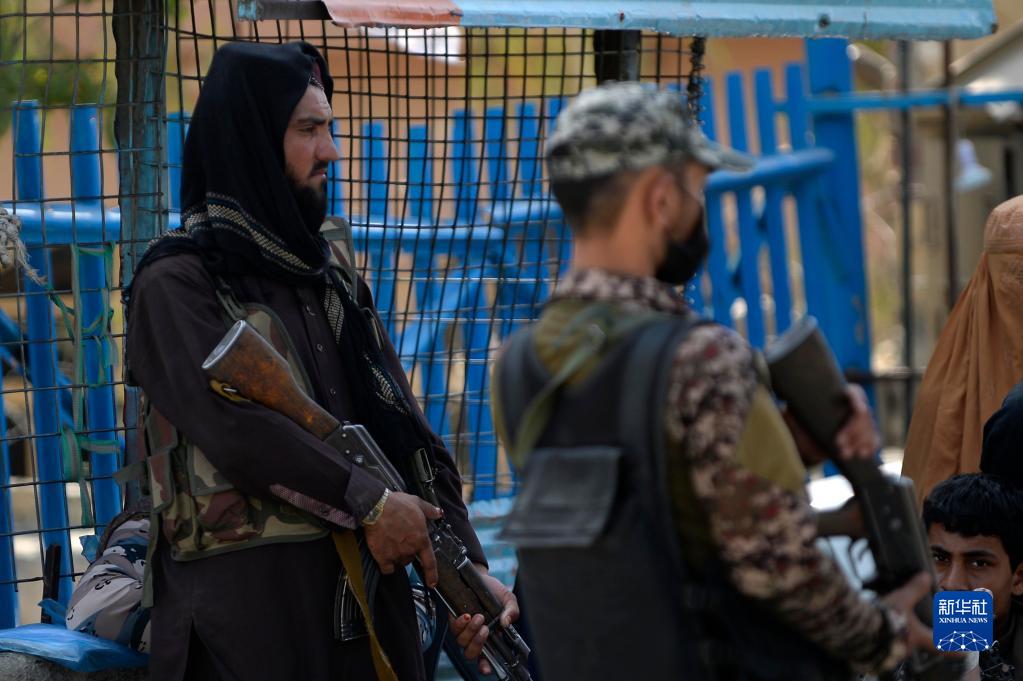 这是9月3日在巴基斯坦与阿富汗的边境口岸多尔哈姆拍摄的一名巴基斯坦士兵(右)与一名阿富汗塔利班人员。新华社发(艾哈迈德·卡迈勒 摄)