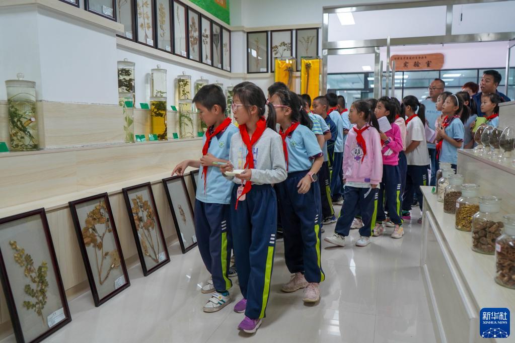 9月2日,在甘肃省定西市陇西县的陇西药圃园,渭州学校的学生参观中草药标本室。