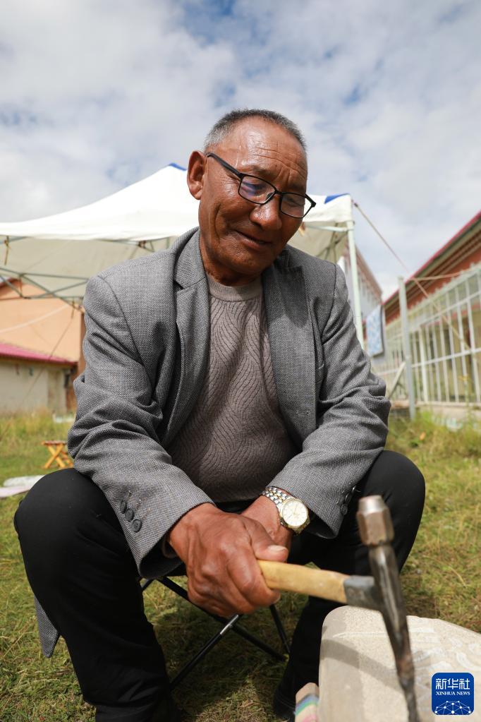 9月2日,在甘肃甘南碌曲县社会综合福利院,藏族老人旦正加木措在雕刻玛尼石。新华社记者 杜哲宇 摄
