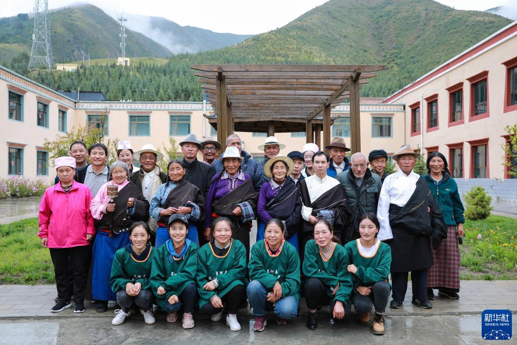 这是甘肃甘南夏河县拉卜楞综合社会福利中心入住老人和工作人员的合影(9月3日摄)。新华社记者 杜哲宇 摄