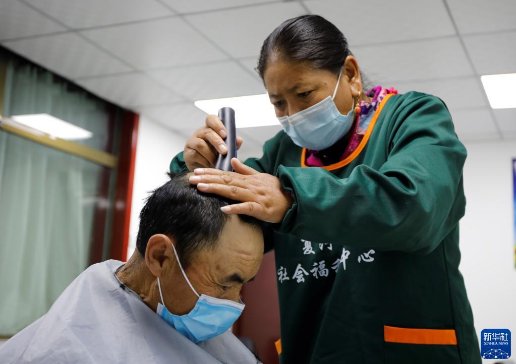 9月3日,在甘肃甘南夏河县拉卜楞综合社会福利中心,护理人员给老人理发。新华社记者 冯亚松 摄