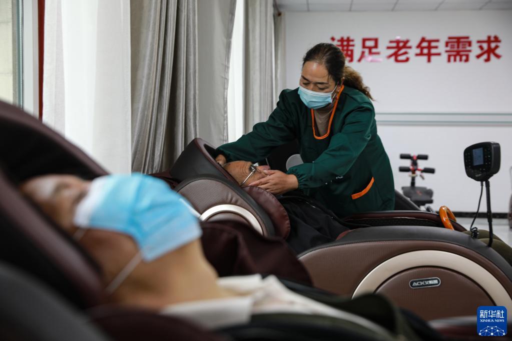9月3日,在甘肃甘南夏河县拉卜楞综合社会福利中心,护理人员帮助老人做按摩。新华社记者 冯亚松 摄