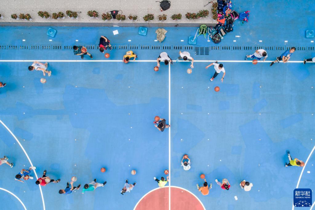 华中师范大学附属小学的学生在打篮球(9月2日摄,无人机照片)。