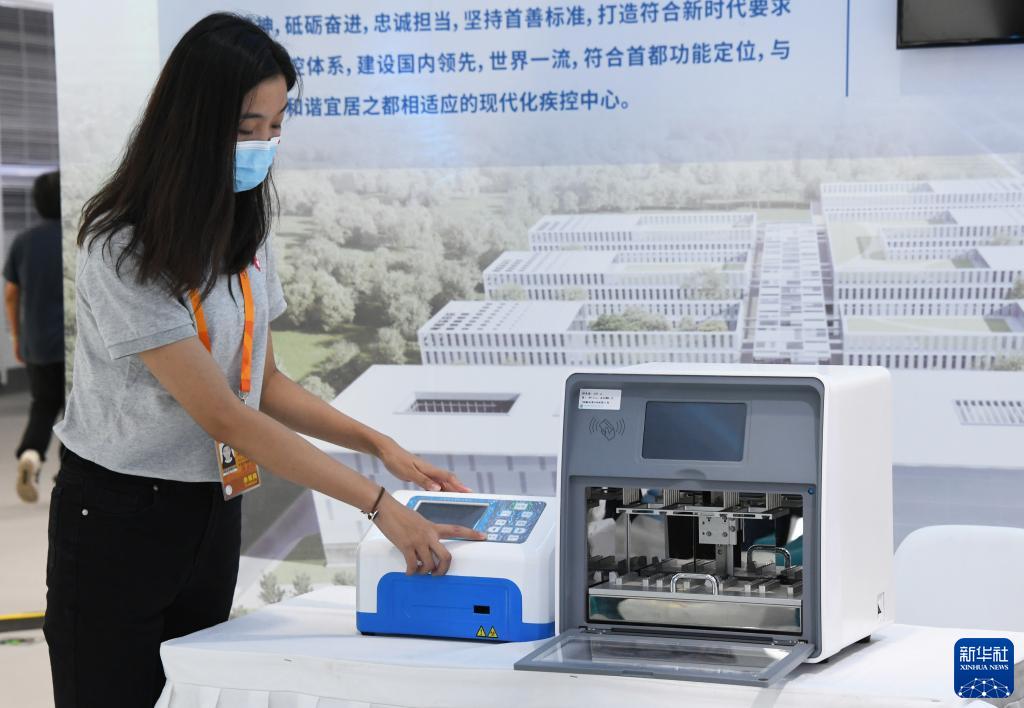 9月4日,在2021年中国国际服务贸易交易会首钢园区健康卫生服务展馆,工作人员介绍核酸检测设备。