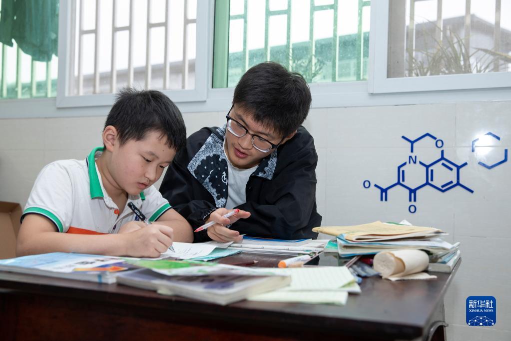 雷波中学高2021届毕业生刘取(右)在家中指导还在上小学的弟弟刘予做暑假作业。他今年被清华大学土木类专业录取(8月26日摄)。新华社记者 沈伯韩 摄