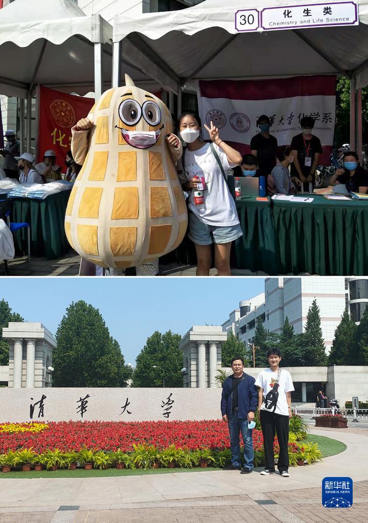 这是一张拼版照片,上图:9月1日,雷波中学高2021届毕业生徐可欣在清华大学报到时与吉祥物“小花生”合影。她被该校化生类专业录取;下图:9月1日,雷波中学高2021届毕业生刘取(右)与父亲在清华大学东门外合影,他被该校土木类专业录取。新华社发(受访者供图)